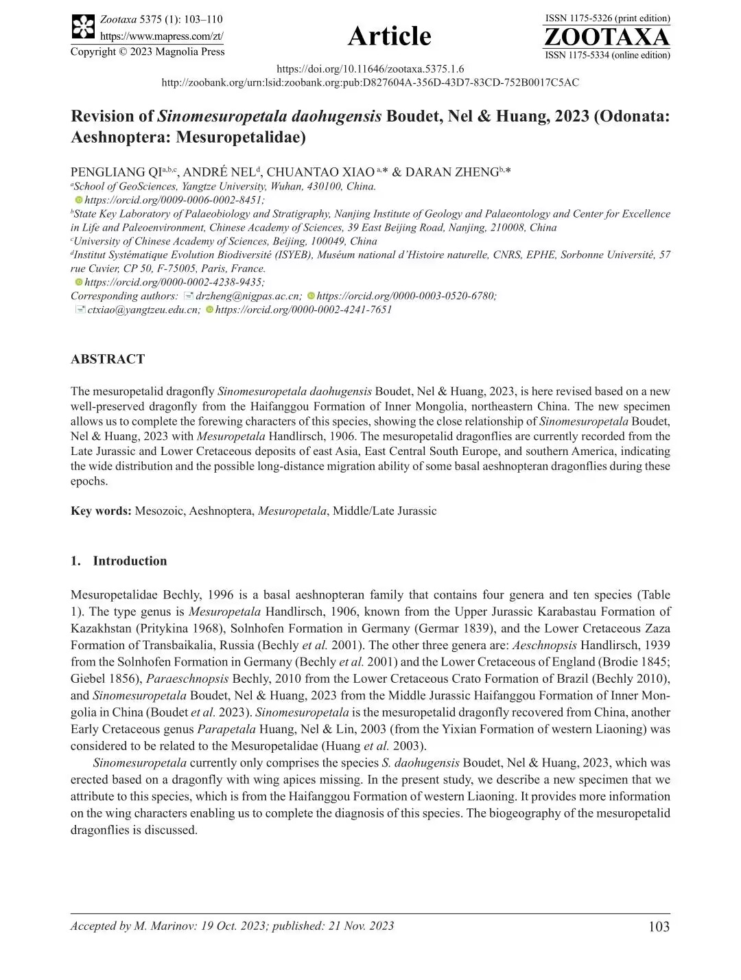 西瓜视频 地质资源与地质工程专业硕士生漆鹏亮在古生物学期刊《ZOOTAXA》上发表题为“Revision of Sinomesuropetala daohugensis Boudet, Nel & Huang, 2023 (Odonata:Aeshnoptera: Mesuropetalidae)”的研究论文。西瓜视频 为论文第一署名单位,漆鹏亮为第一作者,其导师肖传桃教授为第一通讯作者。