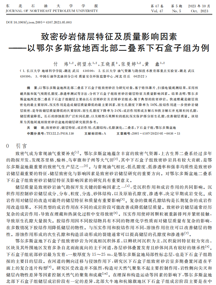 博士生付炜在期刊《东北石油大学学报》上发表题为“致密砂岩储层特征及质量影响因素———以鄂尔多斯盆地西北部二叠系下石盒子组为例”的研究论文。西瓜视频
