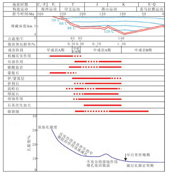 基于鄂尔多斯盆地西北部二叠系下石盒子组砂岩是典型的低孔低渗致密储层,主要为长石岩屑砂岩及岩屑砂岩。砂岩颗粒分选较好,磨圆度较差,以次棱—次圆为主。研究区下石盒子组储层长石溶蚀提供广泛的粒间孔隙,是主要的孔隙类型;石英通过抵抗压实作用保护部分原生孔隙。压实作用造成的孔隙度下降率为58%,是造成储层质量降低的最主要因素;在原始成岩作用中,形成的碳酸盐胶结物占据粒间孔隙,通过阻止后期流体侵入而影响次生孔隙的形成,是造成储层致密的次要因素,原生孔隙度下降率为24%;在中成岩作用过程中,形成的铁方解石通过填充残余粒间孔隙和溶蚀孔隙进一步使砂岩致密。