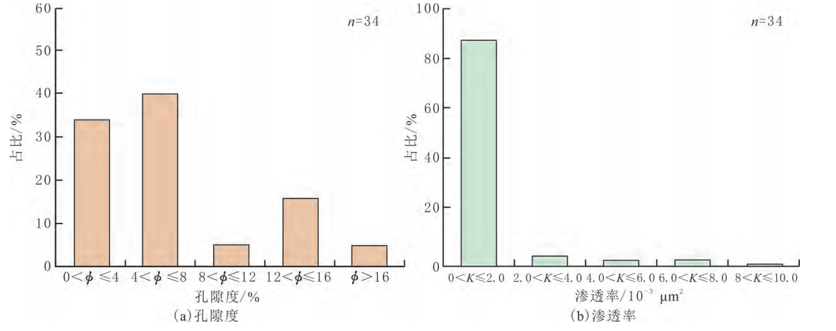 图2 研究区石盒子组致密砂岩砂岩孔隙度和渗透率分布