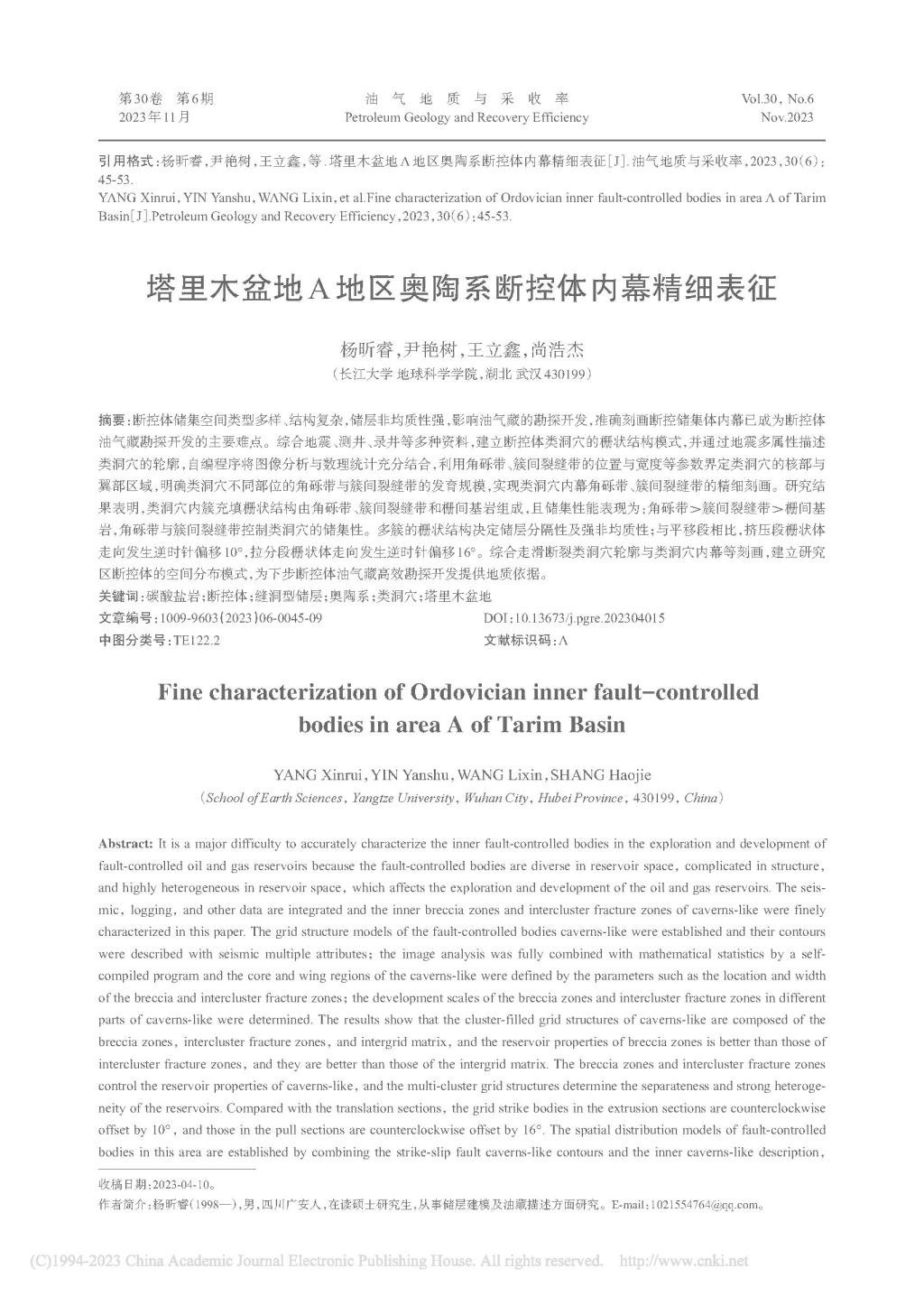地质学研究生杨昕睿在《油气地质与采收》上发表了题为“塔里木盆地A地区奥陶系断控体内幕精细表征”的研究论文。