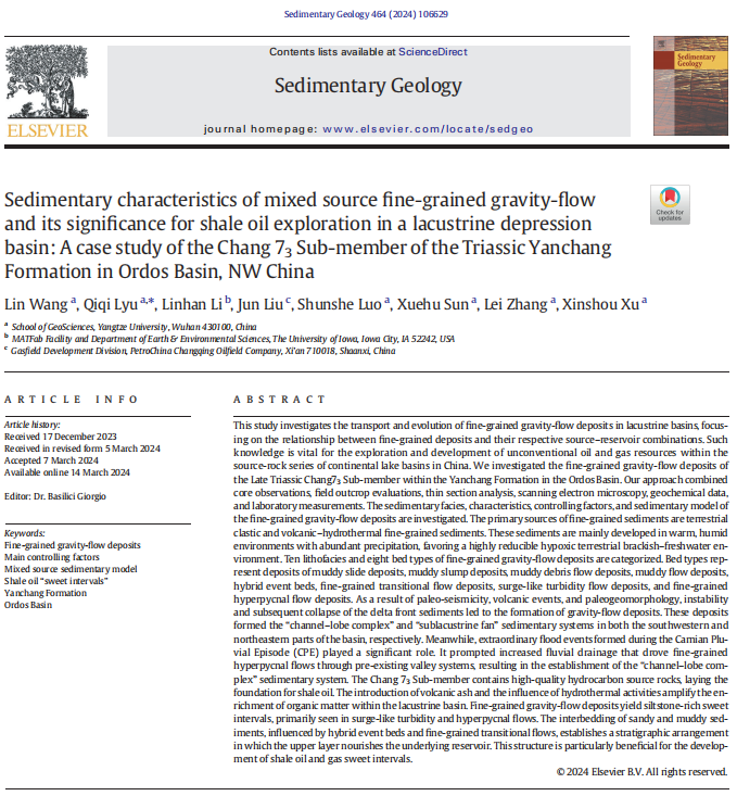 硕士生王林在《Sedimentary Geology》发表题为“Sedimentary characteristics of mixed source fine-grained gravity-flow and its significance for shale oil exploration in a lacustrine depression basin: A case study of the Chang 73Sub-member of the Triassic Yanchang Formation in Ordos Basin, NW China”的研究论文。西瓜视频