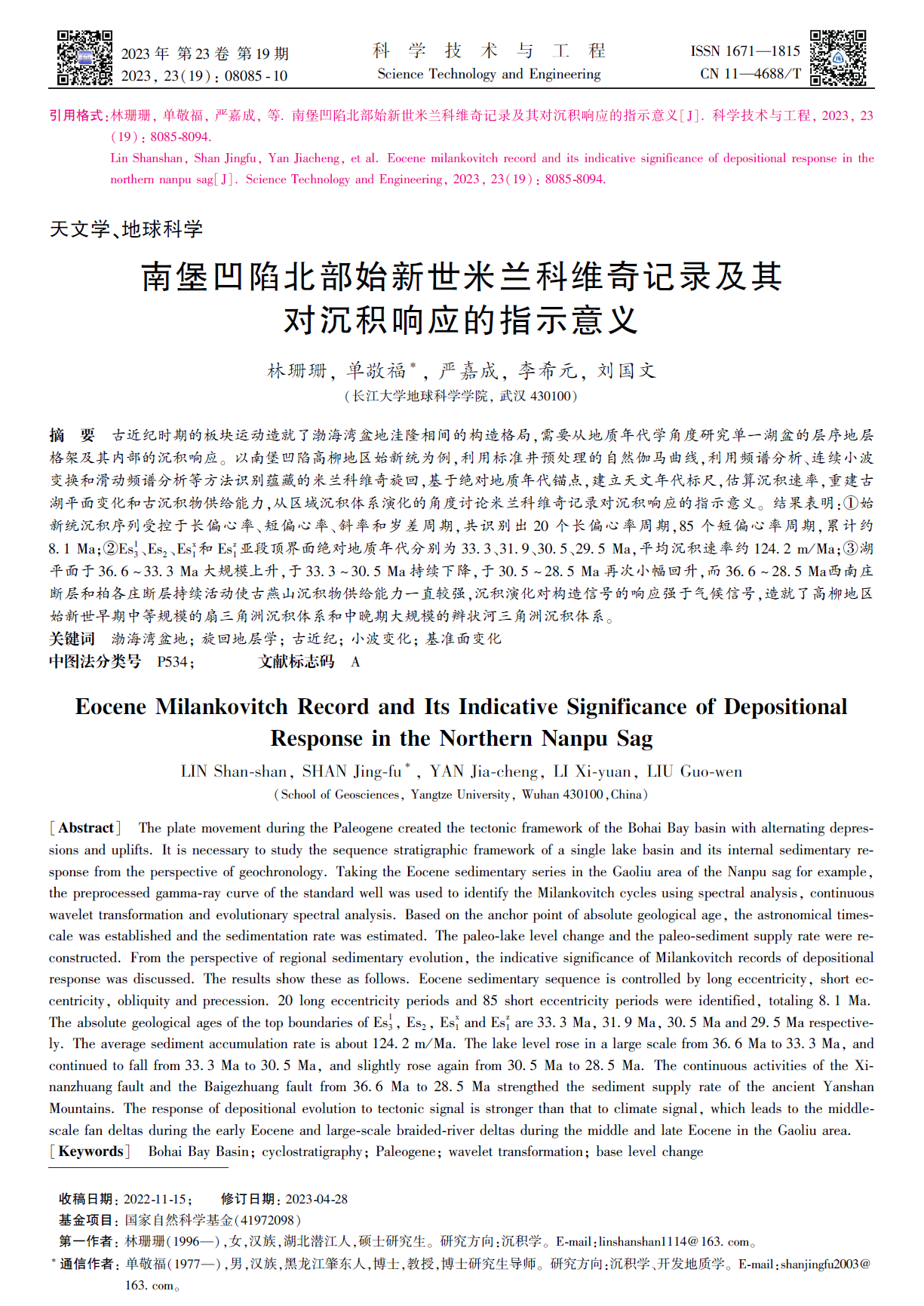 硕士生林珊珊在《科学技术与工程》发表题为“南堡凹陷北部始新世米兰科维奇记录及其对沉积响应的指示意义”的研究论文。西瓜视频