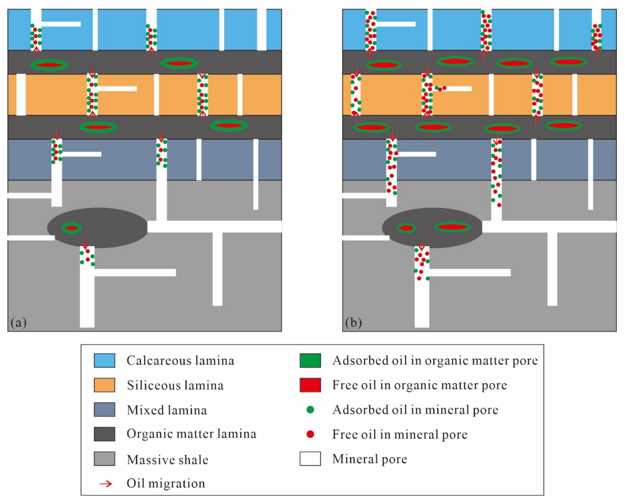 游离油是页岩油产量的主要贡献者,评价不同状态的油(吸附油、游离油)的含量是预测页岩油产能的关键。本文提出了一种评价页岩吸附油和游离油含量的新方法,并以渤海湾盆地沧东凹陷孔店组二段(简称孔二段)页岩为例开展了研究。该方法结合了常规岩石热解和多温阶热解,解决了现有的单一多温阶热解实验无法有效区分游离油和吸附油温度界限的问题(图1),揭示了吸附油和游离油主要赋存于直径>20nm的孔隙中,且其含量主要受页岩有机质丰度和热成熟度的控制。孔隙空间不是影响页岩油赋存状态的决定性因素。最后结合页岩的孔隙结构特征和页岩油赋存特征,提出了页岩油的赋存及演化模型(图2)。本研究结果加深了对页岩油差异富集的认识,为寻找页岩油有利区提供了有效指导。