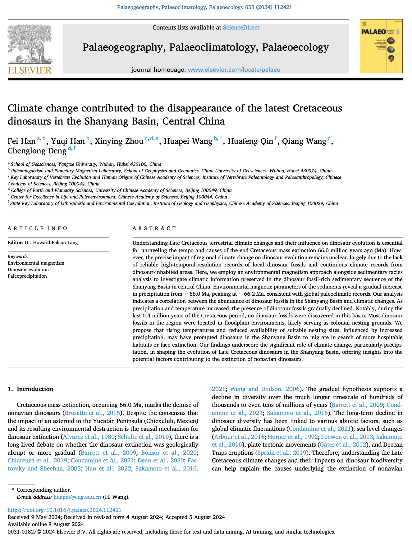论文信息:Han, F., Han, Y., Zhou, X., Wang, H., Qin, H., Wang, Q., & Deng, C. (2024). Climate change contributed to the disappearance of the latest Cretaceous dinosaurs in the Shanyang Basin, Central China. Palaeogeography, Palaeoclimatology, Palaeoecology, 653, 112421.//doi.org/10.1016/j.palaeo.2024.112421