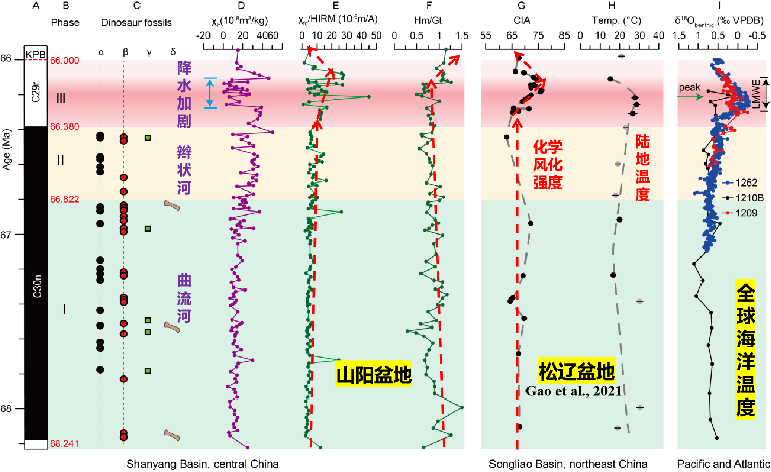 了解晚白垩世陆地气候变化及其对恐龙多样性演化的影响对于揭示6600万年前白垩纪末期恐龙灭绝的原因至关重要。然而,由于缺乏可靠的高时间分辨率的恐龙化石记录和恐龙栖息地的连续古气候记录,目前对于区域气候变化与恐龙多样性演化的关系仍不清楚。针对这个科学问题,该研究采用环境磁学和沉积相分析相结合的方法,深入研究了我国秦岭东部山阳盆地富含恐龙化石的沉积序列中保存的古气候信息,以此揭示晚白垩世气候变化对恐龙多样性演化的影响。