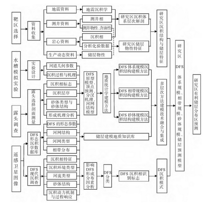 论文研究结果表明:(1)DFS研究中最关键的3个科学问题是明确河网结构和河型演变规律、构建沉积标志和沉积模式、分析其形成和分布的控制因素。(2)DFS研究的主要内容包括建设形态沉积学数据库、现代沉积机理研究、分类研究、建立沉积模式、储层建模与储层预测等5个方面。(3)DFS研究中的关键技术包括基于遥感图像的形态数据采集、形成机理的水槽和模拟实验、河网重构、顶点位置预测与河道分汊点自动生成方法、储层建模知识库平台等。(4)DFS研究的基本工作流程是先建立形态沉积学数据库,搭建数据库软件平台,在此基础上选择具有代表性的DFS进行现代沉积解剖,然后综合现代沉积调查、露头解剖和模拟实验成果,形成分类体系,总结各类DFS的识别标志和沉积模式,分层次建立储层预测模型,形成沉积结构储层预测模型的建模软件平台,从而预测沉积体系中有利储层的分布。