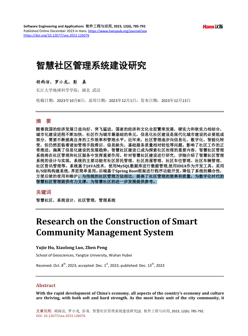 西瓜视频 硕士生胡雨洁在中文期刊《软件工程与应用》上发表了题为“智慧社区管理系统建设研究”的研究论文。西瓜视频 为论文第一署名单位,研究生胡雨洁为论文第一作者,其导师罗小龙教授为该文通讯作者。