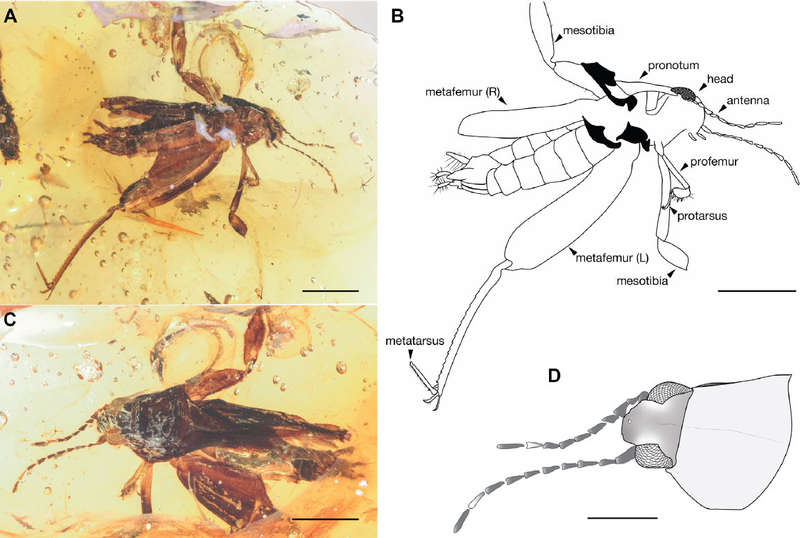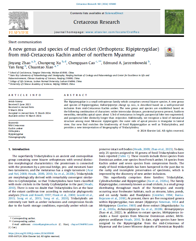 地质学专业硕士研究生赵金阳同学在在地学综合研究领域期刊《Cretaceous Research》上发表题为“A new genus and species of mud cricket (Orthoptera: Ripipterygidae) from mid-Cretaceous Kachin amber of northern Myanmar”的研究论文(图1)。西瓜视频