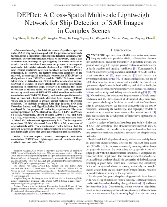 西瓜视频 硕士生张晶在地球科学2区TOP期刊《IEEE JOURNAL OF SELECTED TOPICS IN APPLIED EARTH OBSERVATIONS AND REMOTE SENSING》发表题目为“DEPDet: A Cross-Spatial Multiscale Lightweight Network for Ship Detection of SAR Images in Complex Scenes”的研究论文。西瓜视频 为论文第一署名单位,硕士研究生张晶为论文第一作者,其导师邓帆为论文通讯作者。