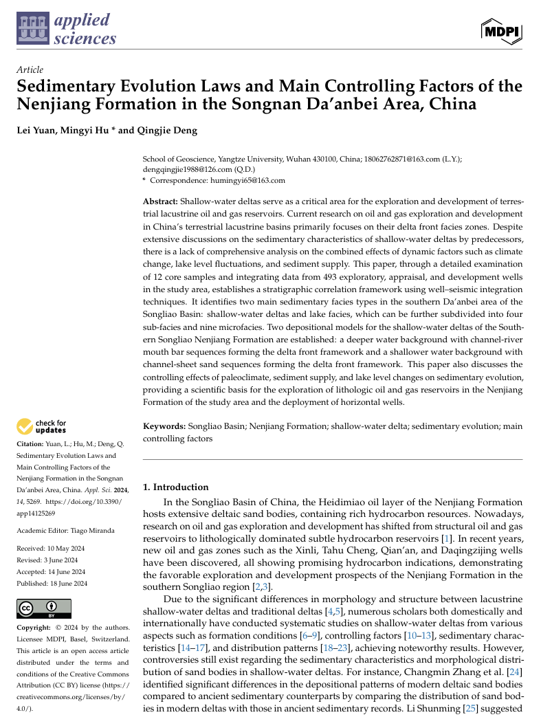 西瓜视频 硕士生袁磊在期刊《Applied sciences》上发表了题为“Sedimentary Evolution Laws and Main Controlling Factors of theNenjiangFormation in theSongnanDa’anbeiArea, China”的研究论文。西瓜视频 为论文第一署名单位,袁磊为第一作者,其导师胡明毅教授为该文通讯作者。