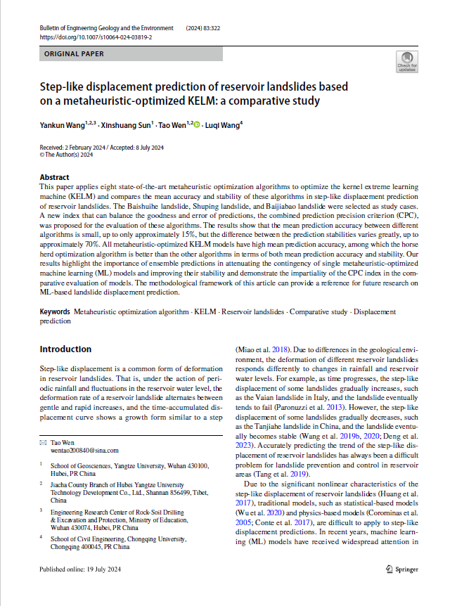 教师王艳昆副教授以第一作者身份在2区SCI期刊《Bulletin of Engineering Geology and the Environment》发表题为《Step-like displacement prediction of reservoir landslides based on a metaheuristic-optimized KELM: a comparative study》的研究论文。西瓜视频