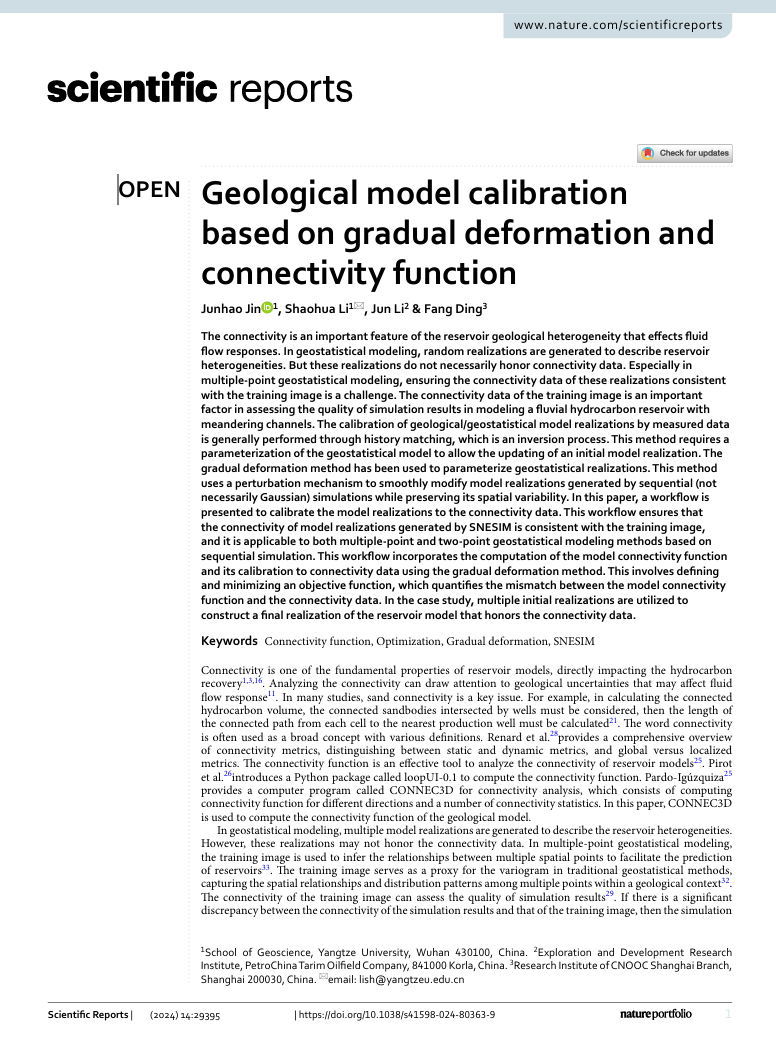 西瓜视频 李少华教授团队长期从事地质统计学建模的研究,团队成员金俊浩在《Scientific Reports》期刊上发表题为“Geological model calibration based on gradual deformation and connectivity function”的研究论文。西瓜视频 为论文第一署名单位,硕士研究生金俊浩为论文第一作者,其导师李少华教授为该文通讯作者。