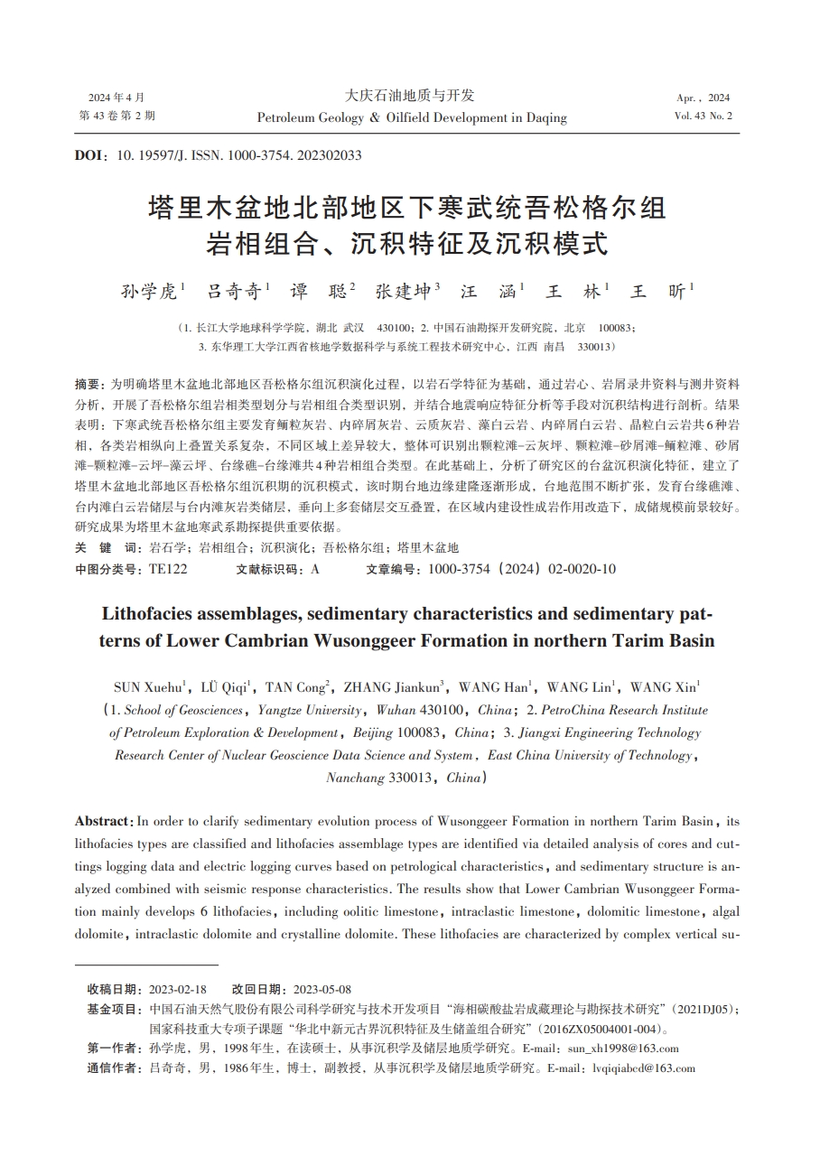 硕士生孙学虎在《大庆石油地质与开发》上发表了题为“塔里木盆地北部地区下寒武统吾松格尔组岩相组合、沉积特征及沉积模式”的研究论文,采用岩相学、沉积学的方法,分析了塔北地区下寒武统吾松格尔组沉积特征演化过程。西瓜视频
