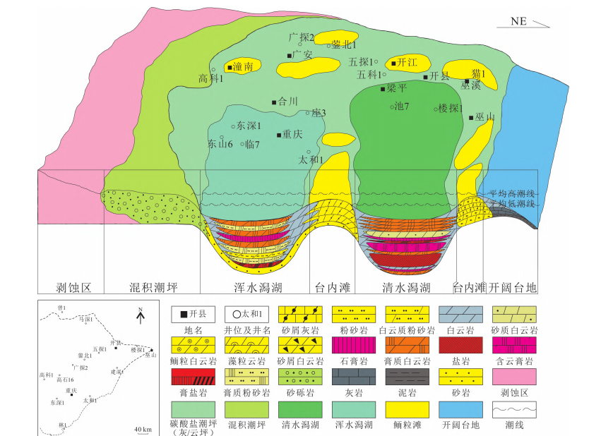 该研究对川东地区高台组蒸发岩的岩性进行分类,分别讨论不同岩性组合序列的沉积环境,分析现今高台组蒸发岩的残余厚度和盖层厚度,建立蒸发岩的成因模式,论述龙王庙组和高台组的储盖组合模式,最终预测了龙王庙组和高台组的有利勘探区。结果表明:①川东中寒武统高台组蒸发岩可分为膏盐岩类、石膏岩类、含膏白云岩类、含膏灰岩类、含膏泥岩类和含膏砂岩类,共6类;高台组蒸发岩厚度在平面上从西向东逐渐增厚,盖层分布具有“宽广圆环状”的特点;②蒸发岩在干旱炎热的古环境、障壁滩形成的封闭环境、海水的周期性波动以及物源补给的共同作用下形成清水潟湖和浑水潟湖,即源控多潟湖成因环境(图1);③高台组蒸发岩厚度与龙王庙组储层的分布存在一定的负相关关系,即厚层蒸发岩控低含气储层,薄层蒸发岩控高含气储层;④蒸发岩为盖层的储盖组合包括浑水潟湖成因的盐下储层和清水潟湖成因的盐间储层,薄层蒸发岩盐下储层含气规模较大,盐间储层的非均质性较强,厚度较薄,总体上呈中—低孔低渗的特征,研究区发育3个天然气有利勘探区带(图2),分别位于北部、中部以及南部地区,是川东地区潜在的后备勘探领域。