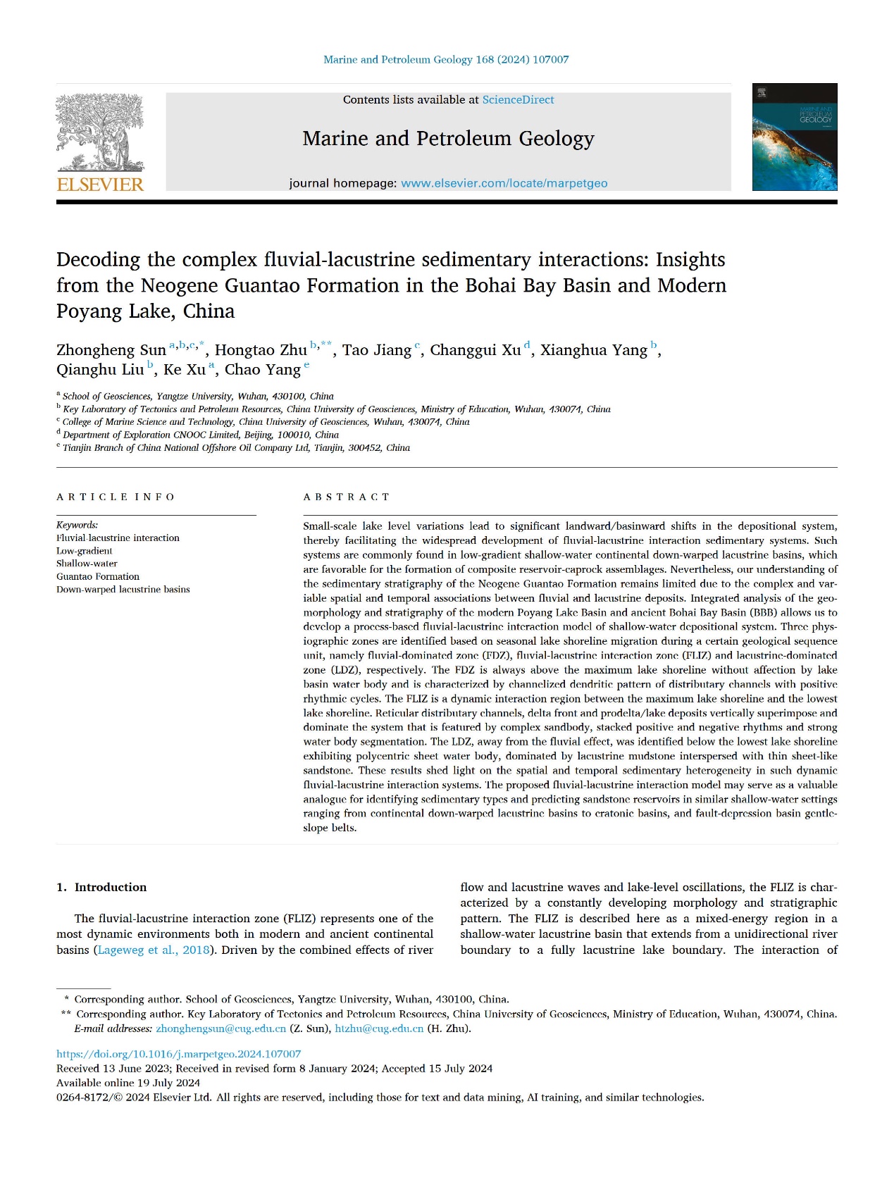 西瓜视频 教师孙中恒博士以第一作者身份在石油地质领域主流期刊《Marine and Petroleum Geology》以“Decoding the complex fluvial-lacustrine sedimentary interactions: Insights from the NeogeneGuantaoFormation in the Bohai Bay Basin and Modern Poyang Lake, China”为题发表论文,该项研究得到了国家自然科学基金项目和博士后面上项目的资助。
