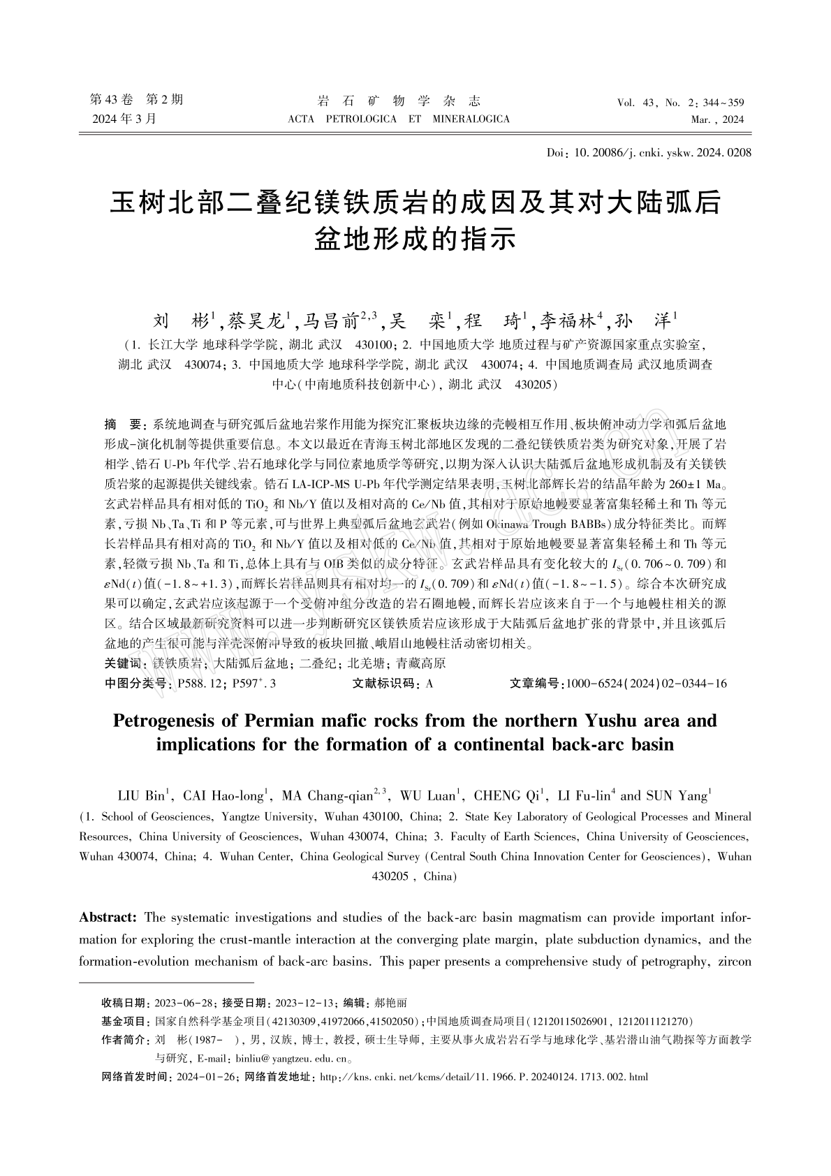 刘彬教授团队在《岩石矿物学杂志》期刊上发表题为“玉树北部二叠纪镁铁质岩的成因及其对大陆弧后盆地形成的指示”的研究论文。刘彬教授为第一作者和通讯作者,该项研究得到了国家自然科学基金等项目资助。