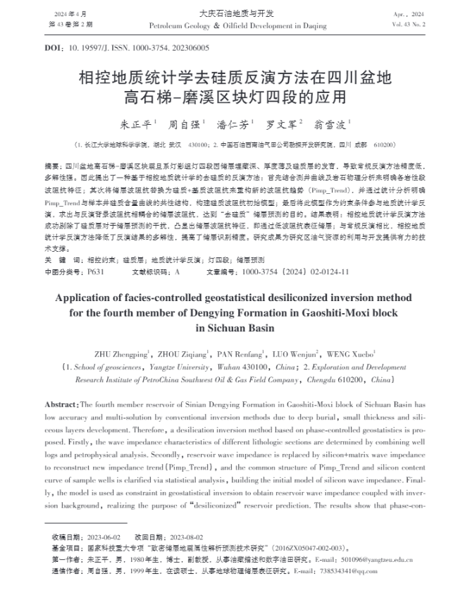 西瓜视频 地科系教师朱正平博士在石油地质学领域主流期刊《大庆石油与地质》上发表题为“相控地质统计学去硅质反演方法在四川盆地高石梯-磨溪区块灯四段的应用”的研究论文。