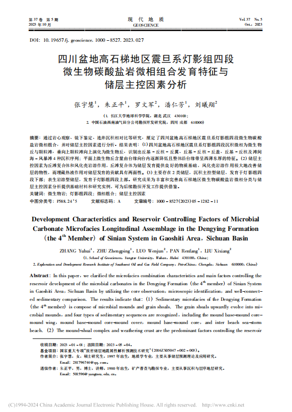 地科系教师朱正平博士在石油地质学领域主流期刊《现代地质》上发表题为“四川盆地高石梯地区震旦系灯影组四段微生物碳酸盐岩微相组合发育特征与储层主控因素分析”的研究论文。