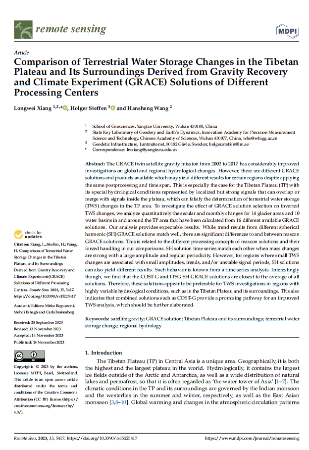 地信系教师相龙伟博士在《REMOTE SENSING》期刊发表题为‘Comparison of Terrestrial Water Storage Changes in the TibetanPlateau and Its Surroundings Derived from Gravity Recoveryand Climate Experiment (GRACE) Solutions of DifferentProcessing Centers’的论文,揭示了不同数据中心解算GRACE卫星重力数据对应青藏高原TWSC结果有差异。