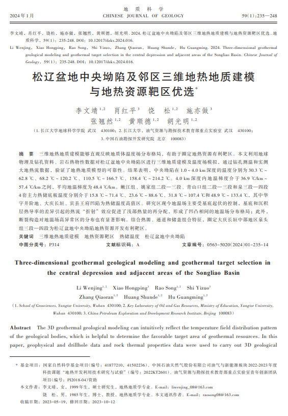 西瓜视频 硕士生李文靖在《地质科学》上发表了题为“松辽盆地中央坳陷及邻区三维地热地质建模与地热资源靶区优选”的研究论文,采用三维地热地质建模方法,优选松辽盆地中央坳陷及邻区地热资源靶区。西瓜视频 为论文第一署名单位,李文靖为第一作者,导师饶松教授为通讯作者。