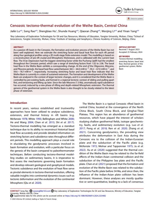 西瓜视频 硕士生芦佳飞在国际知名地学期刊《International Geology Review》上发表了题为“Cenozoic tectono-thermal evolution of the Weihe Basin, Central China”的研究论文,系统揭示了渭河盆地新生代以来构造-热演化过程。西瓜视频 为论文第一署名单位,芦佳飞为第一作者,导师饶松教授为通讯作者。