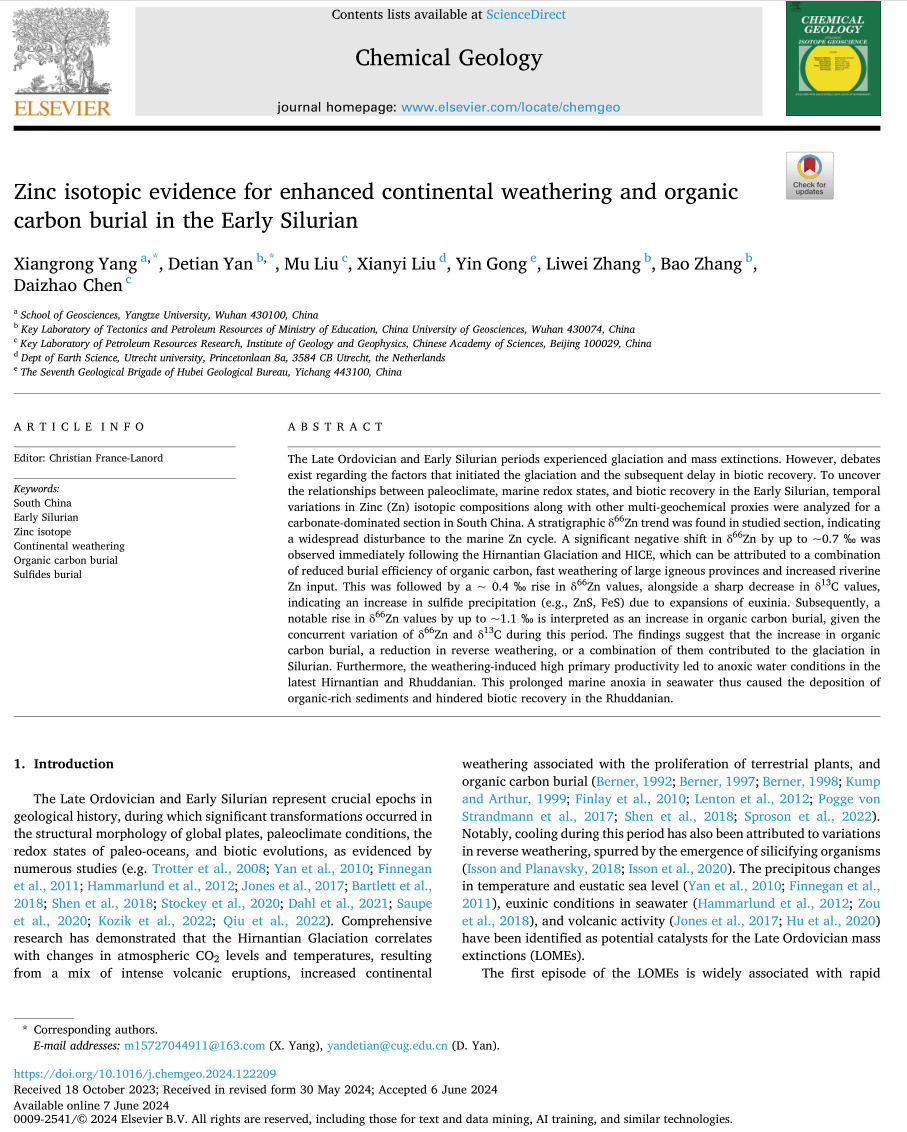 地质系教师杨向荣在地学TOP期刊《Chemical Geology》上发表题为“Zinc isotopic evidence for enhanced continental weathering and organic carbon burial in the Early Silurian”的研究论文。