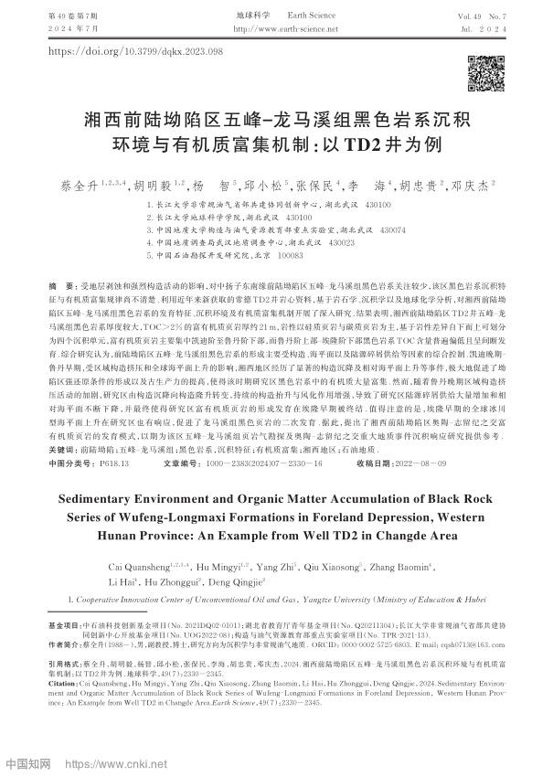 地质系教师蔡全升博士在《地球科学》上发表了题为“湘西前陆坳陷区五峰‒龙马溪组黑色岩系沉积环境与有机质富集机制:以TD2井为例”的研究论文。