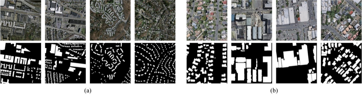 图2 基于WHU建筑物数据集(a)和Massachusetts建筑物数据集(b)对比进行实验