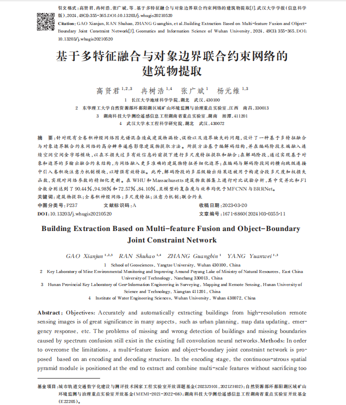 高贤君副教授在遥感领域主流期刊《武大学报》上发表题为“基于多特征融合与边界联合约束网络的建筑物提取”的研究论文。