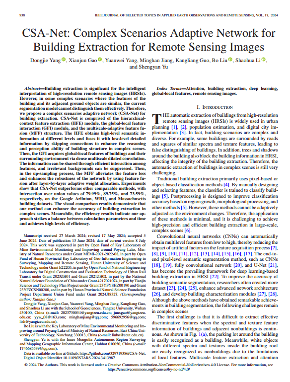西瓜视频 杨栋杰博士在郭康良教授和高贤君副教授的指导下,在成像科学和摄影技术主流期刊《IEEE JOURNAL OF SELECTED TOPICS IN APPLIED EARTH OBSERVATIONS AND REMOTE SENSING》上发表题为“CSA-Net: Complex Scenarios Adaptive Network for Building Extraction for Remote Sensing Images”的研究论文。