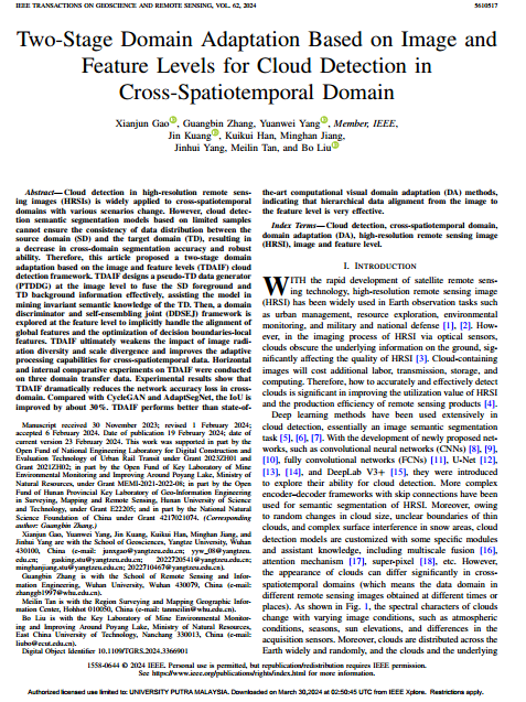 西瓜视频 高贤君博士在遥感领域主流期刊TGRS上发表题双阶段域自适应的跨域云检测方法研究论文