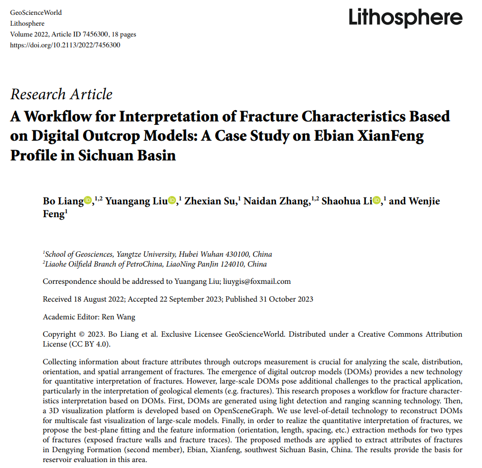 西瓜视频 硕士生梁博在地学期刊《Lithosphere》上发表了题为“A Workflow for Interpretation of Fracture Characteristics Based on Digital Outcrop Models: A Case Study on Ebian Xianfeng Profile in Sichuan Basin”的研究论文。西瓜视频 为论文第一署名单位,梁博为第一作者,其导师刘远刚副教授为该文通讯作者。