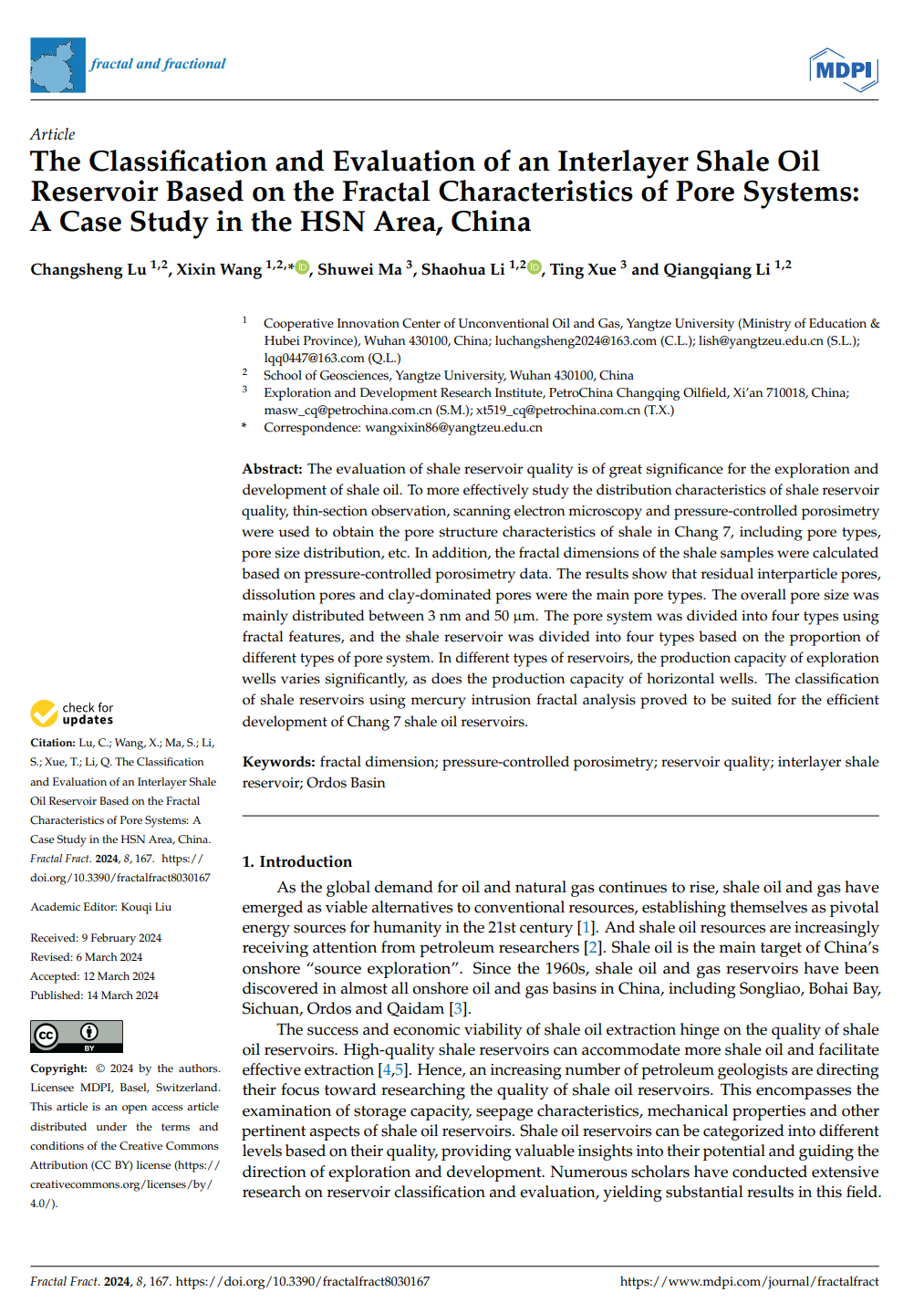石油系王喜鑫博士在石油地质学领域主流期刊《Fractal and fractional》上发表题为“TheClassiffcationand Evaluation of an Interlayer Shale Oil Reservoir Based on the Fractal Characteristics of Pore Systems: A Case Study in the HSN Area, China”的研究论文。
