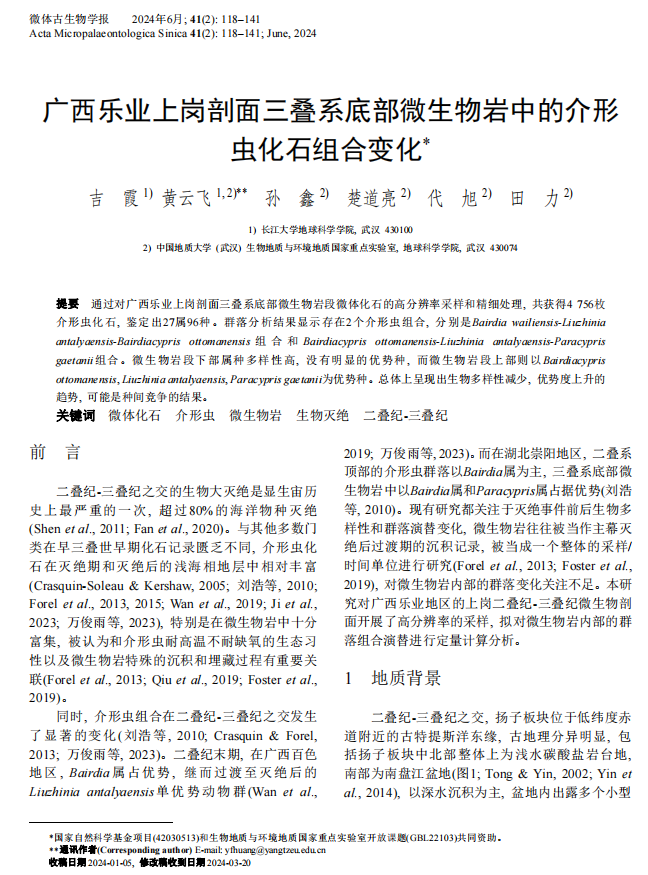 黄云飞教授团队长期从事古-中生代之交重大地质转折期生物灭绝与生物复苏方面的研究,团队成员吉霞在古生物学领域核心期刊《微体古生物学报》上发表题为“广西乐业上岗剖面三叠系底部微生物岩中的介形虫化石组合变化”的研究论文。西瓜视频