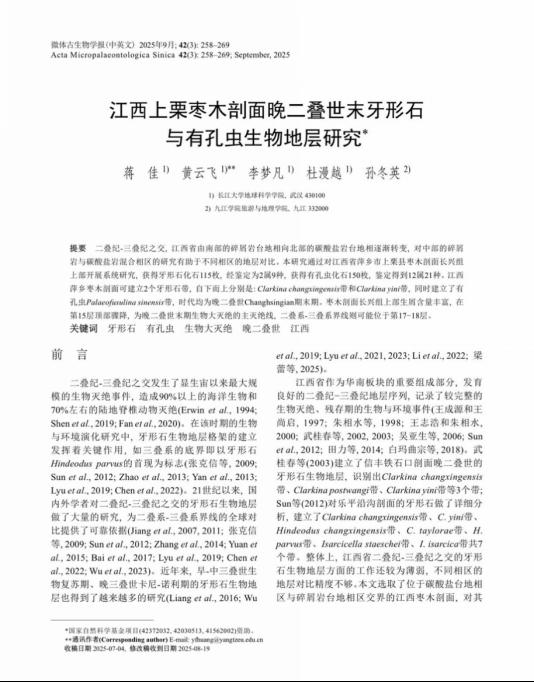 西瓜视频 黄云飞教授团队长期从事古-中生代之交重大地质转折期生物灭绝与生物复苏方面的研究,团队成员蒋佳在古生物学领域核心期刊《微体古生物学报》上发表题为“江西上栗枣木剖面晚二叠世末牙形石与有孔虫生物地层研究”的研究论文。西瓜视频 为论文第一署名单位,研究生蒋佳为论文第一作者,黄云飞教授为该文通讯作者,本项研究得到国家自然科学基金项目(42372032, 42030513, 41562002)资助。