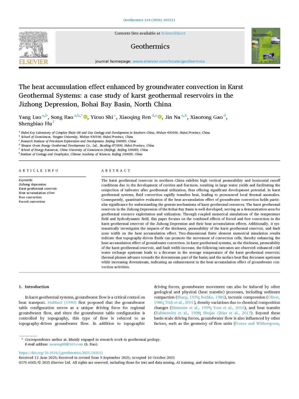 硕士生罗洋在饶松教授的指导下,在期刊《Geothermics》上发表题为“The heat accumulation effect enhanced by groundwater convection in karst geothermal systems: a case study of karst geothermal reservoirs in the jizhong depression, bohai bay basin, north China”的研究论文,西瓜视频