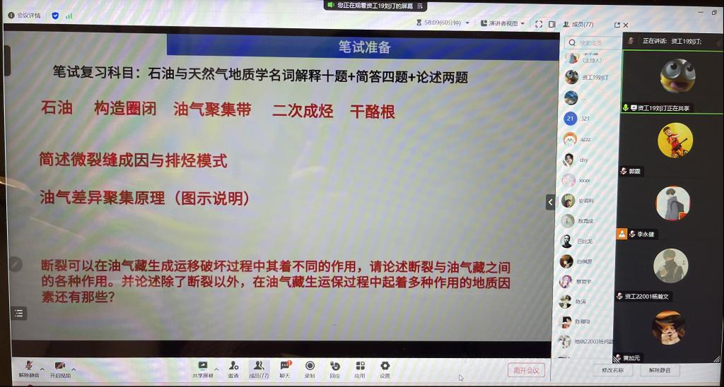陈雅琦同学介绍了中国地质大学(武汉)GIS中心的复试流程,包括面试、笔试、上机环节,提醒大家要制定合理的复习计划,保证基础知识的全面掌握,熟悉软件操作步骤、多做模拟题。还以一位同学的简历作为例子进行了“手把手”的修改指导,帮助大家明白简历该如何突出亮点,展现优势。刘汀同学针对手标本鉴定、地震剖面图识别、卫星图像识别地质现象等实验考核环节,提醒大家考前多观察多练习。两位同学还就是否需要提前联系导师等问题给出了自己的经验和建议。