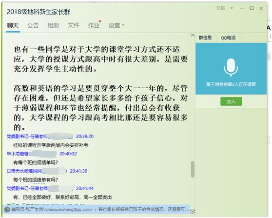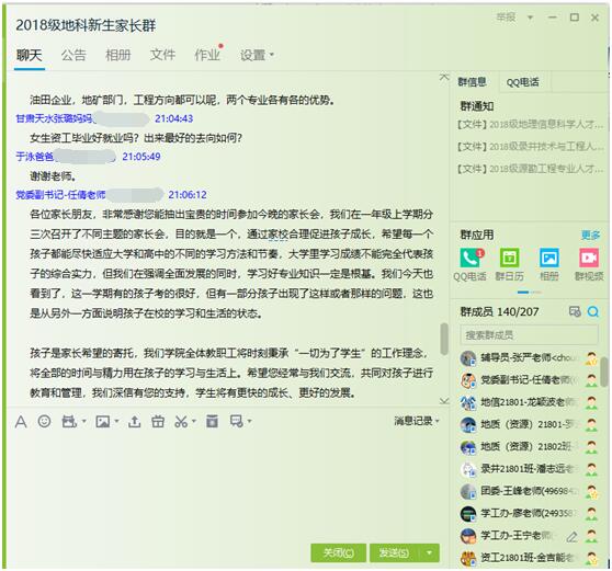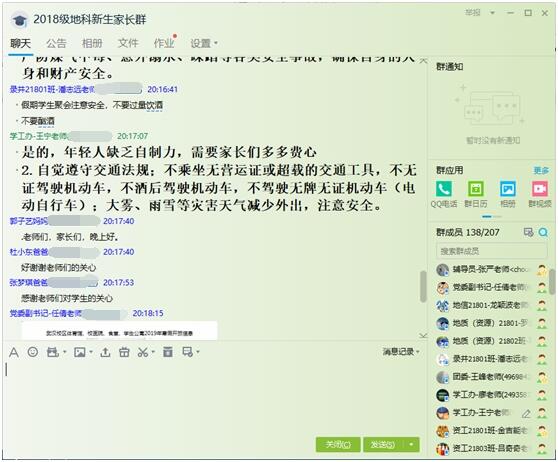 (通讯员 张严)为强化寒假安全教育工作,认真做好2018级期末考试分析总结工作,西瓜视频 于2019年1月26日晚8点在“2018级地科新生家长群”中召开了2018级本科生第二次线上家长会,学院党委副书记任倩、辅导员潘志远以及学生家长共计160余人参与了讨论,家长会由年级辅导员王宁主持。