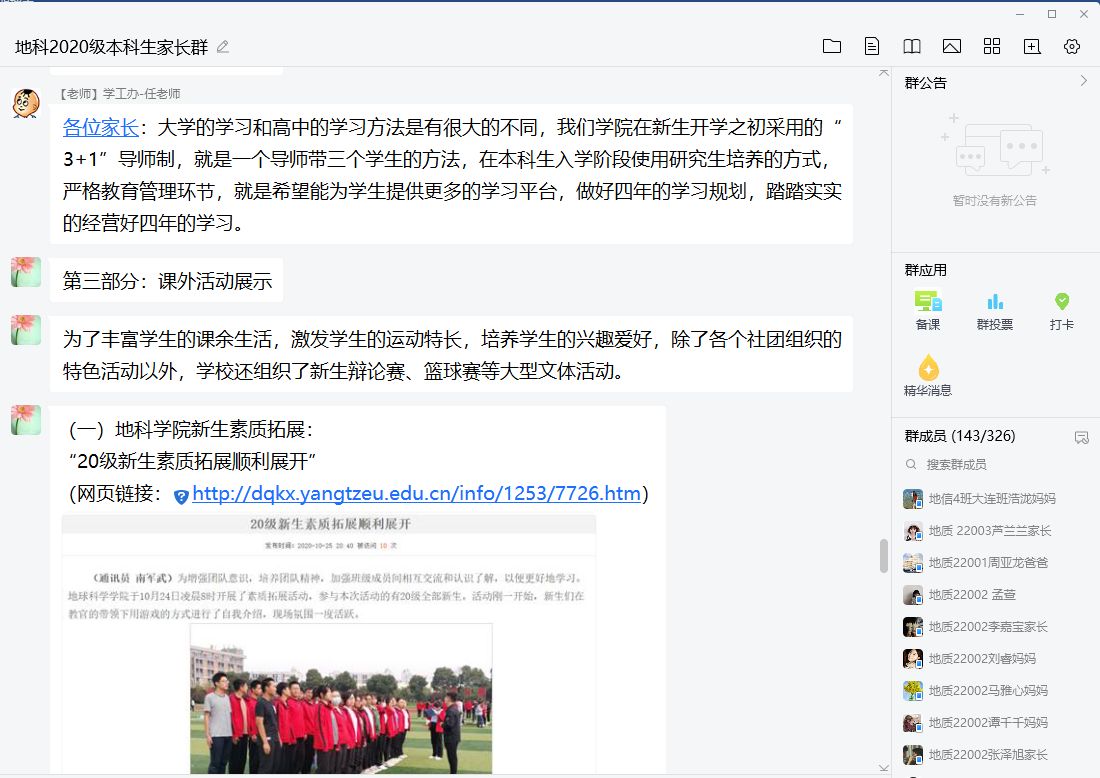 (通讯员:郭霖)11月20日晚7点半,2020级本科生家长群热闹非凡,学工办全体老师与家长们齐聚一堂,召开了20级本科生第一次线上家长会。本次家长会由学院党委副书记任倩老师主持,20级辅导员郭霖老师以“文字+图片”的形式,主要从安全教育、学习情况总结、课外活动三个方面向家长们展示了同学们在校期间的学习与生活。