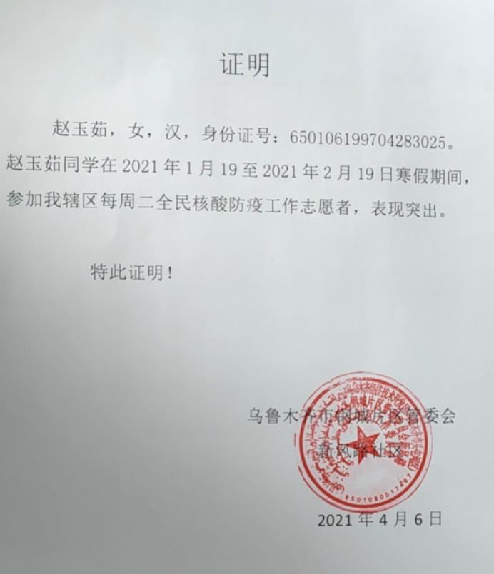 1月中旬,刚刚返回家乡,两个小时的时差没能挡住矿物学QX201班赵玉茹同学做志愿者的热情。在一个月的志愿工作时间里,社区300余名居民需要开展4次核酸检测,时间紧任务重,作为3名核酸检测工作队中的一员,她在参加培训后,每天上午九点,就早早地来到新疆社区服务中心穿上防护服开始工作。“请大家排好队,一个一个来进行检测,不用着急。”赵玉茹指挥着前来做核酸检测的居民,同时耐心介绍核酸检测的流程。“大家看这个示意图,等下我会用棉签在喉咙沾几下,可能会有些不舒服,请大家忍一忍,免得伤到喉咙。”赵玉茹善意地提醒着。取咽拭子、检测场所消杀、为检测阴性的居民在出入证明上盖章......穿着厚厚防护服的她,每天脱下时,里面的衣服常是湿透的,一个月下来,本就清瘦的她又瘦了几斤。为此,她表示,在国家最需要我们的时刻,总有人要冲在最前面,作为当代大学生,虽是父母眼中的“弱女子”,但责无旁贷,必须挺身而出。