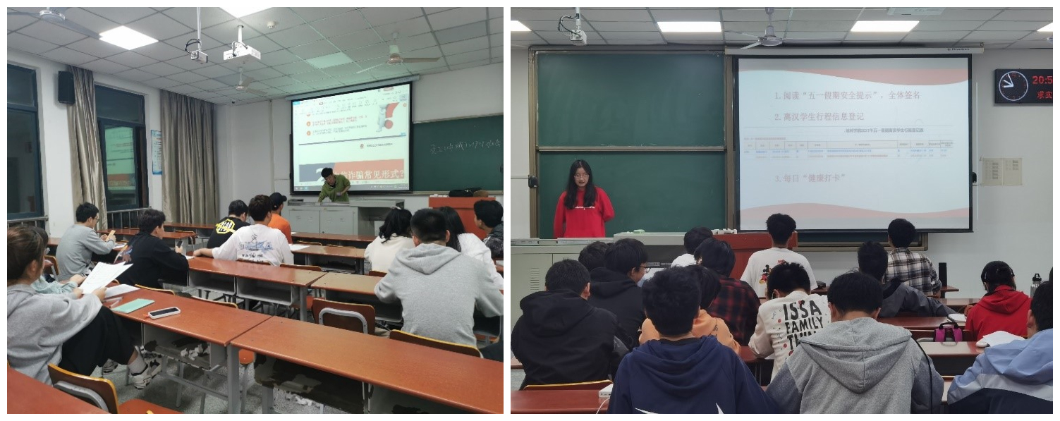 接下来,郭霖老师针对一系列安全问题做了详细安排和说明。一是宿舍管理方面。郭老师通报了4月份西瓜视频 学生宿舍使用违规电器和晚归情况,并对事件危害进行了分析,提醒大家务必遵守学校相关规定,安全高于一切。二是五一假期安全。要求各班班长召开安全主题班会,在班会上做好防溺水、运动安全、防电信诈骗和五一假期安全四个方面的教育,重点做好“国家反诈中心”APP和微信公众号“金钟罩”的下载与认证、假期离汉学生的行程登记、假期安全教育告知书的签收等。