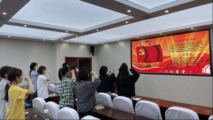 怀着澎湃且又庄严的心情宣读完入党誓词后活动进入第二项,大家集体诵读并学习了《中国共产党章程》第八章的内容:明确了党的纪律检察机关的设立、机构、产生、职权和基本工作规则等,随后深入学习《习近平总书记论青少年成长(第三辑)》,并研读习近平总书记关于《中共中央关于制定国民经济和社会发展第十四个五年规划和二〇三五年远景目标的建议》的说明,以及习近平主席在求是上发表的著作。