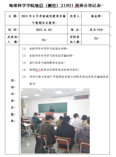 根据会议要求安排,西瓜视频 所有班级已于6月11日下午17:00前开展考风考纪、反诈骗及安全教育主题会议,全院学生100%签署 “四六级考试承诺书”、 “端午节”假期安全提示。