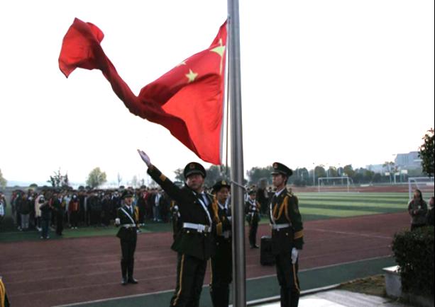 在场师生深怀着对祖国无限的热爱和崇高的敬意,行注目礼的同时齐唱国歌。国旗在晨曦中,迎着朝阳冉冉升起。