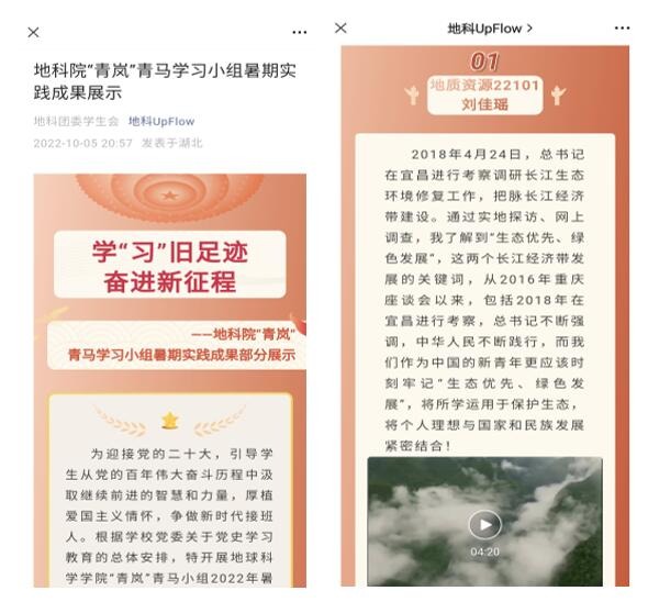为扩大活动影响力,让更多同学了解并投入到暑期三下乡社会实践活动中,学院将同学们制作的调研视频在学院微信公众号“地科UpFlow”上进行了展示,并得到了广泛关注,大家积极点赞,主动转发。