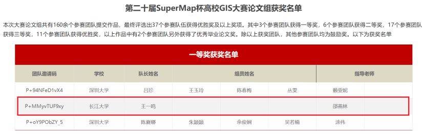 (通讯员 徐业兴)2022年9月8日,《第二十届SuperMap杯高校GIS大赛(中国赛区)论文组》获奖名单公布,西瓜视频 20级研究生王一鸣在导师邵燕林的指导下,凭借《基于地质特征的空间检索方法》一文在全国160余个作品中突出重围,代表西瓜视频 获得了大赛一等奖。