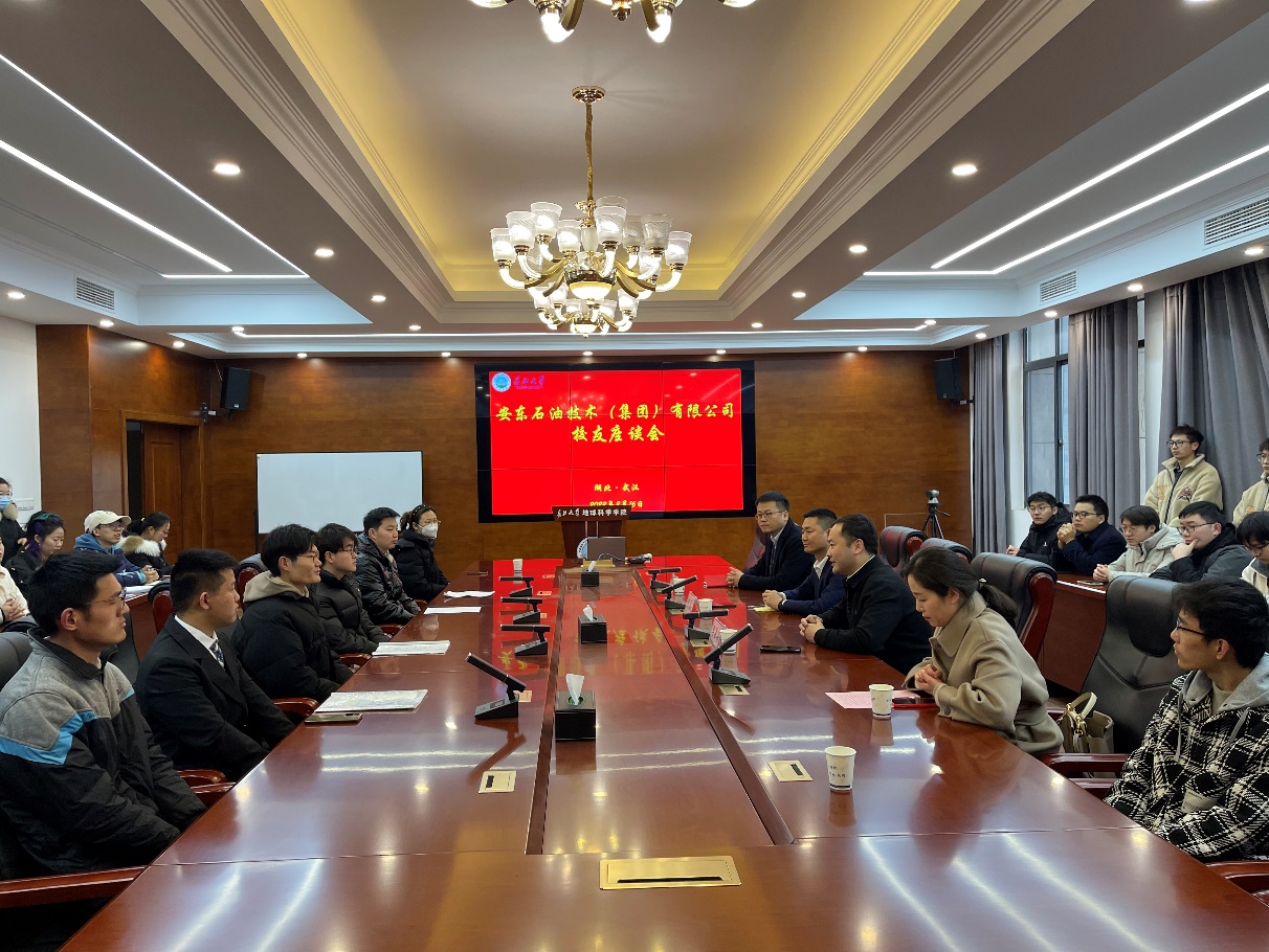 2月16日下午4时30分,安东石油技术(集团)有限公司校友在石油科技大楼C201会议室与部分2023届毕业生进行座谈。