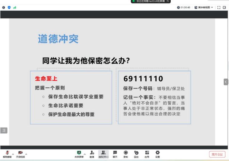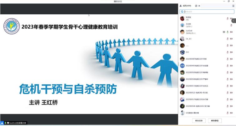 (通讯员 张梦琪)西瓜视频 于2023年6月30日通过腾讯会议的方式举行以“危机干预与自杀预防”为主题的心理讲座。各年级班长、团支书、安全员、心理委员、寝室长及暑期留校学生等共计499名师生参与学习交流,心理专干王红桥老师主讲。