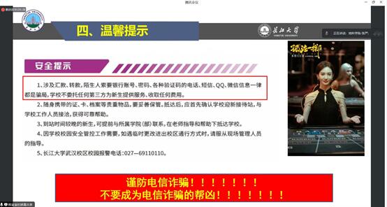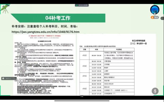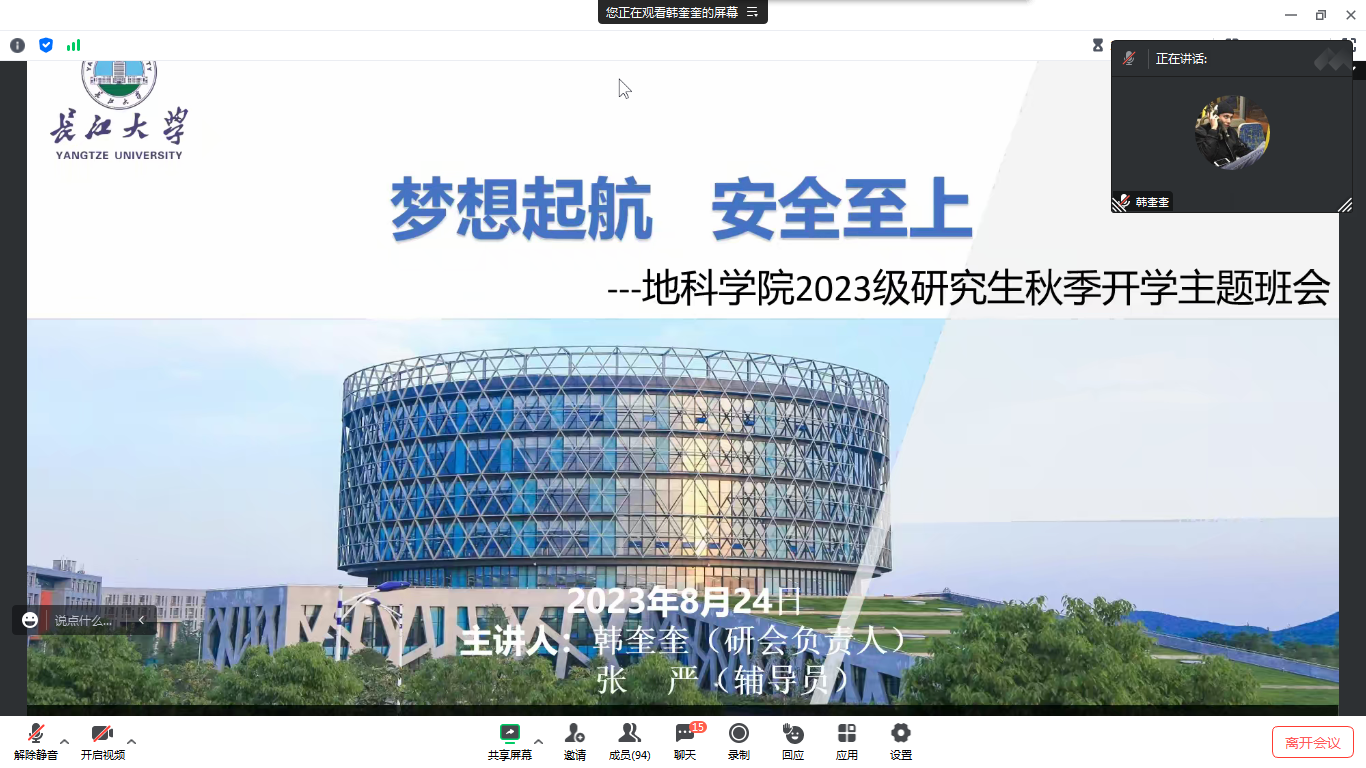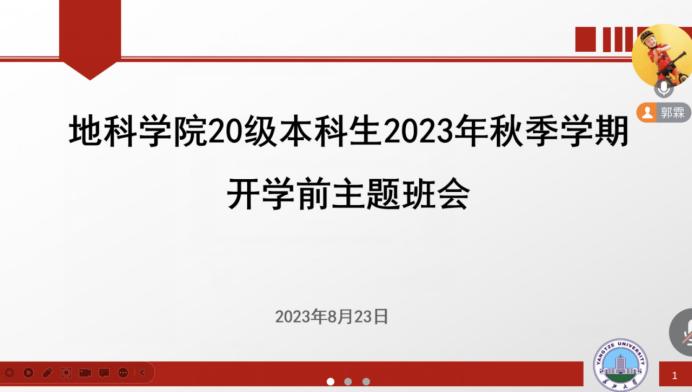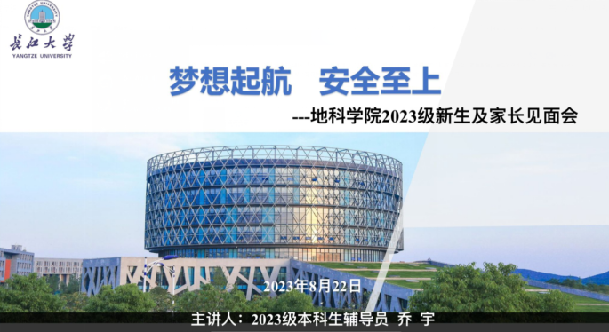 此外,2023级新生也于8月22日晚召开了“西瓜视频 2023级新生及家长见面会”,辅导员乔宇老师分别从学校概况、迎新安排、开学前安全教育和大家关心的其他事项四个方面向新同学以及家长做了详细介绍。此外还邀请到了地科22301班班主任陈旭老师讲话,他寄语同学们珍惜大学时光,合理规划时间,树立远大理想,为社会主义现代化建设贡献自己的力量。最后乔老师对学生及家长的提问逐一进行解答,提醒同学们假期内要保障自身安全,期待在知音湖畔与同学们相见!